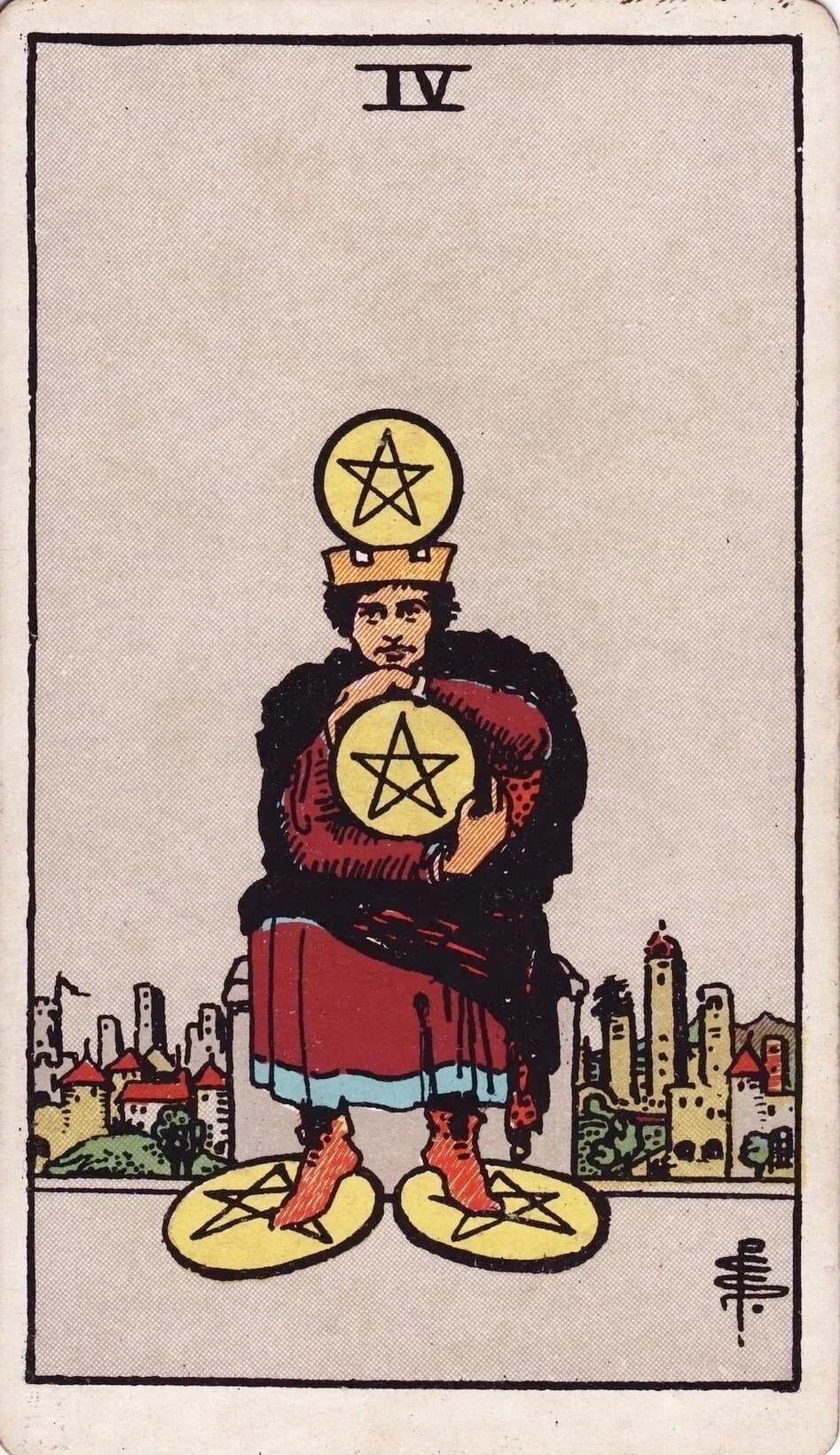 The Four of Pentacles often appears when there is technically enough, enough money to get by, enough structure to feel contained but no sense of ease or overflow. Every dollar is watched. Every resource is accounted for. There is stability, but it’s tight. The underlying fear is usually not about having nothing, but about losing what little sense of security has been built. This card can show up when someone accepts less than they deserve, stays in a job or situation that pays the bills but drains the spirit, or clings to what’s familiar because uncertainty feels too risky.